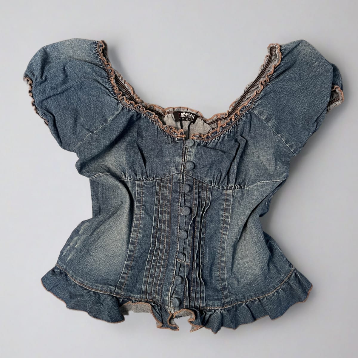Denim corset-style blouse featuring a button front, puff sleeves, ruffle trim, and lace-up detail at the back.